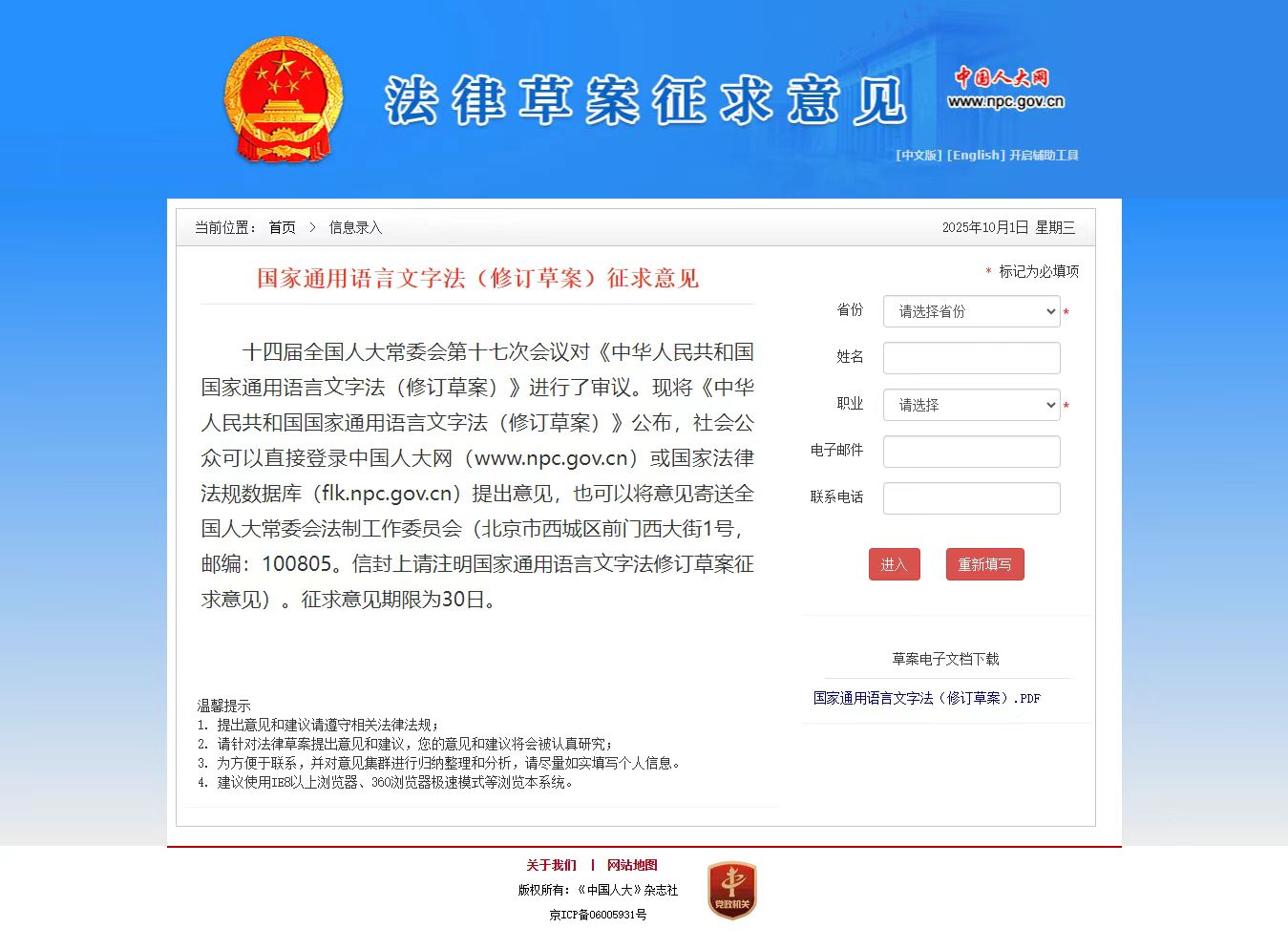 十四届全国人大常委会第十七次会议对《中华人民共和国国家通用语言文字法(修订草案)》进行了审议。现将《中华人民共和国国家通用语言文字法(修订草案)》公布,社会公众可以直接登录中国人大网(www.npc.gov.cn)或国家法律法规数据库(flk.npc.gov.cn)提出意见,也可以将意见寄送全国人大常委会法制工作委员会(北京市西城区前门西大街1号,征求意见期限为30日。粤人/粤机构/粤村镇
